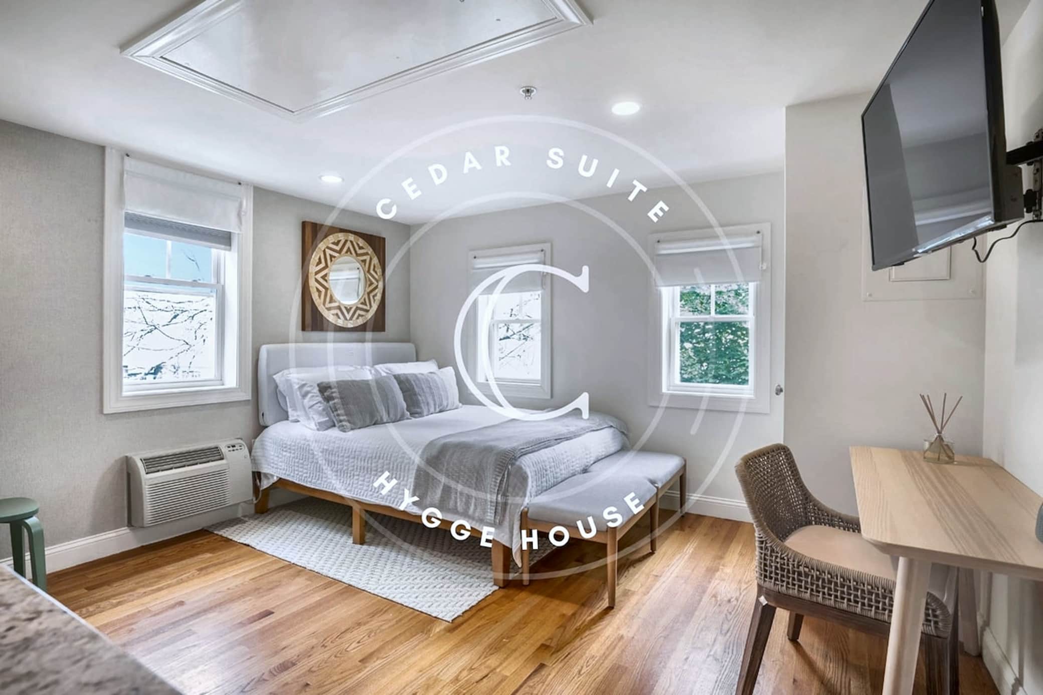The Cedar Suite is a cozy second-floor private suite at Hygge House in downtown Newburyport. Includes a queen bed, ensuite bath, kitchenette, fast Wi-Fi, Smart TV, and Bluetooth self-check-in. Walk to local shops, restaurants, and the waterfront. No guest laundry. Limited first-come parking.
