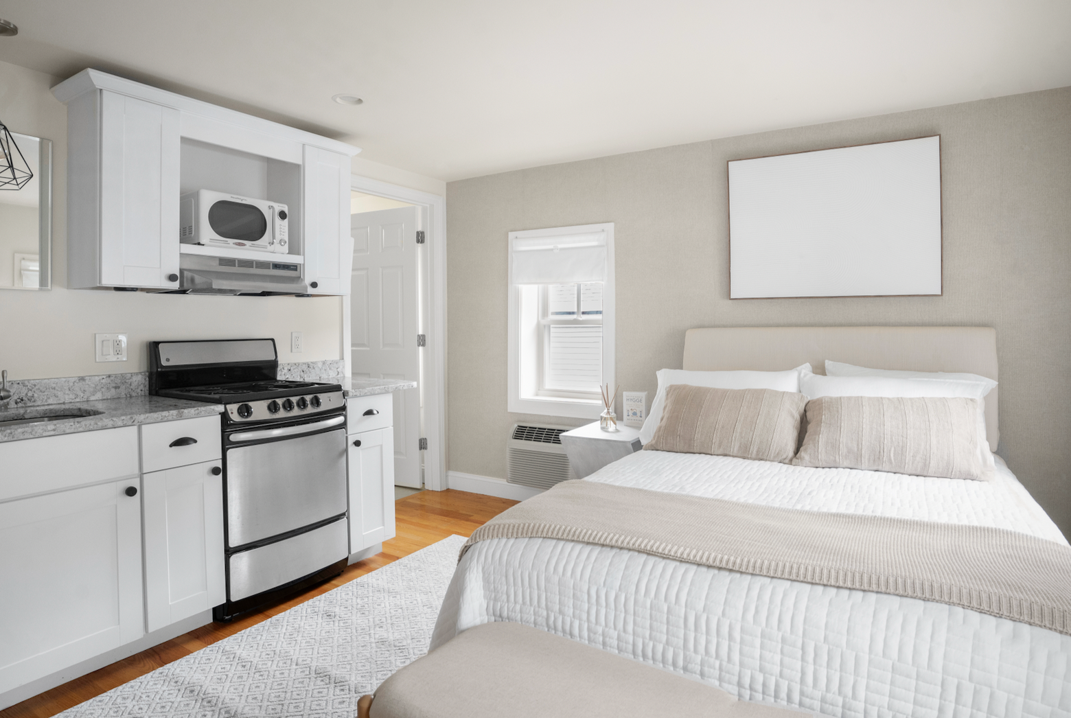 The Jade Suite is a private third-floor retreat at The Hygge House, 11 Charter Street, downtown Newburyport. Features a queen bed with premium linens, private ensuite bath, and full kitchenette with fridge, microwave, and coffee maker. Top-floor quiet and seclusion. Walk to waterfront restaurants, bookshops, and galleries. Includes Wi-Fi, Smart TV, climate control, and Bluetooth check-in. Ideal for special occasions and solo retreats. No guest laundry. Limited first-come parking.