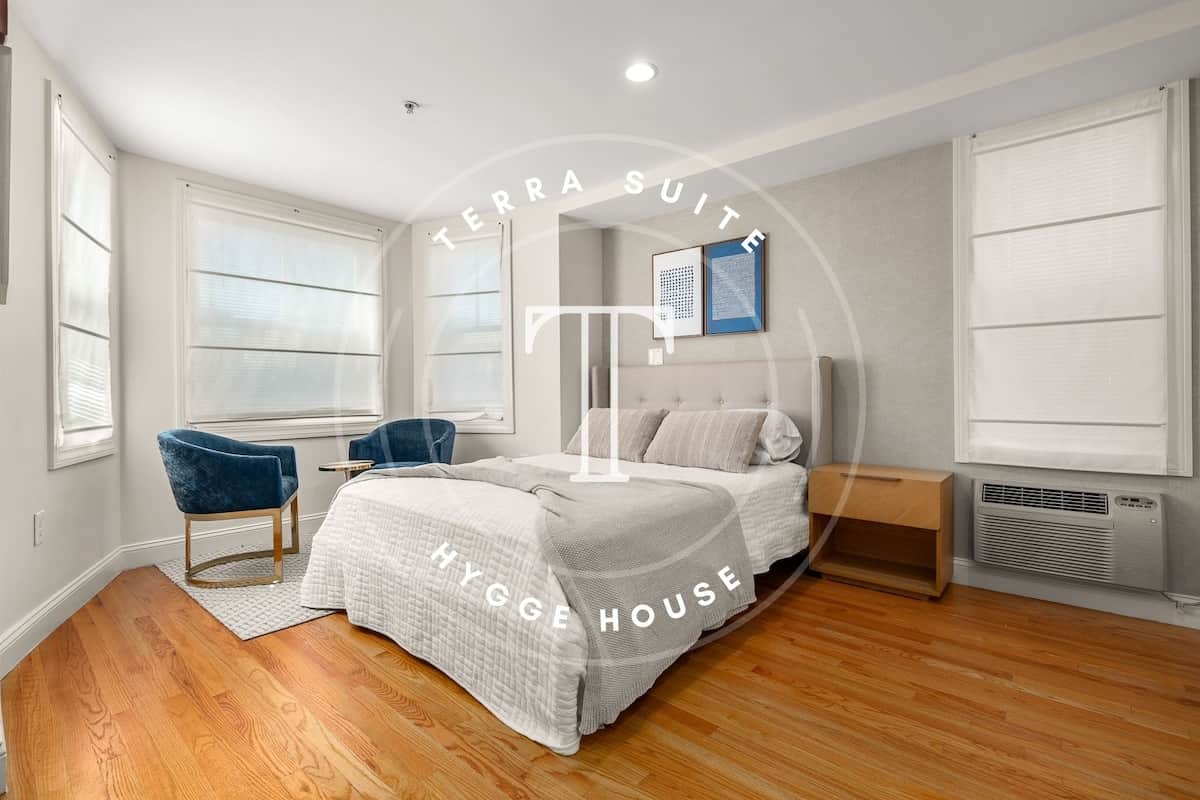 The Terra Suite is grounded in earthy tones and natural textures โ a warm third-floor retreat at The Hygge House, 11 Charter Street, downtown Newburyport. Features a queen bed, ensuite bath, kitchenette, Wi-Fi, and Smart TV. Walk to the waterfront, restaurants, and shops.